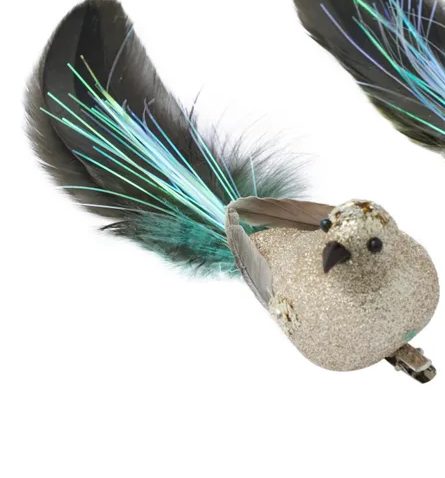 Bird Clip Gold Glitter Green Feather 2 Pack 16cm