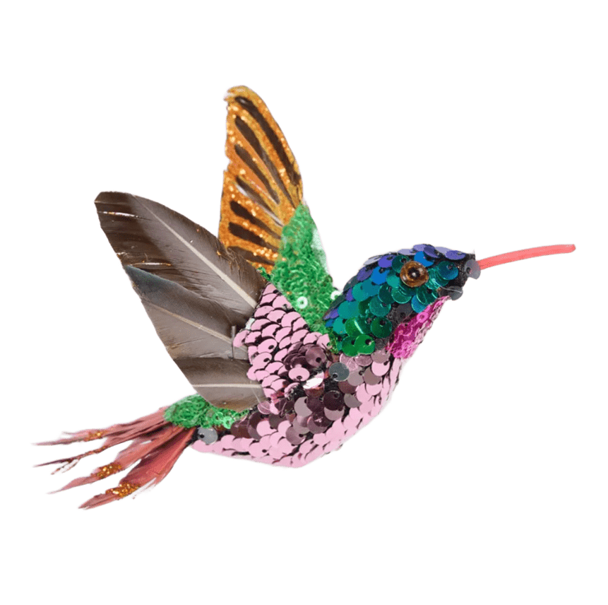 This adorable hummingbird ornament sparkles with pink, blue and green sequins and shimmering gold glitter detailing on its delicate wings. This sweet 17cm decoration adds a magical touch of color and charm to your Christmas tree or festive display.