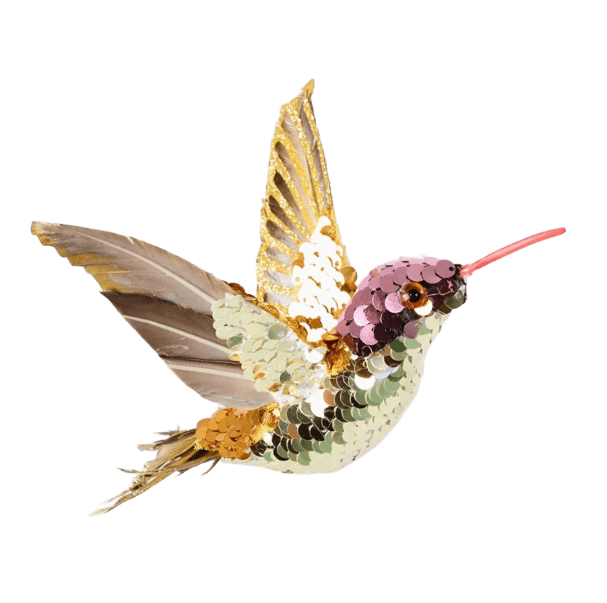 Delightful hummingbird ornament adorned with shimmering sage green, gold and pink sequins. This charming 17cm Christmas decoration adds a touch of whimsy and sparkle to your holiday tree. Perfect for nature lovers and those seeking unique festive accents.