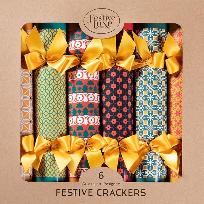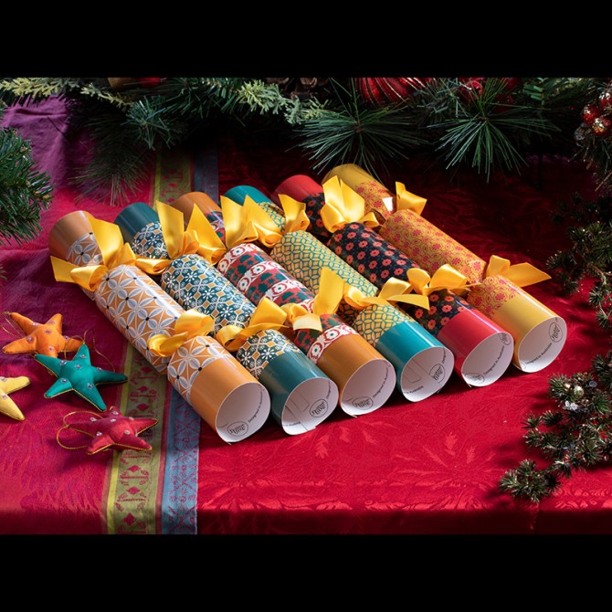 Elevate your holiday table with our Bold Pattern Crackers. Each pack contains 6 vibrantly designed bon bons featuring eye-catching patterns. Pull apart to reveal a festive paper hat, joke and a colourful wine charm.