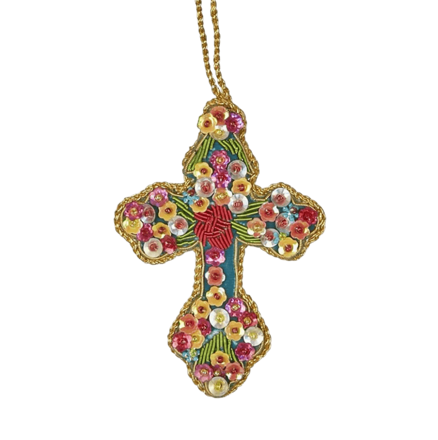 Elevate your holiday decor with this exquisite 9cm Cross Sequin Hanging. Crafted from sumptuous blue fabric, this ornament features meticulous embellishment with an array of multicoloured sequins, delicate beads, and refined embroidery work.