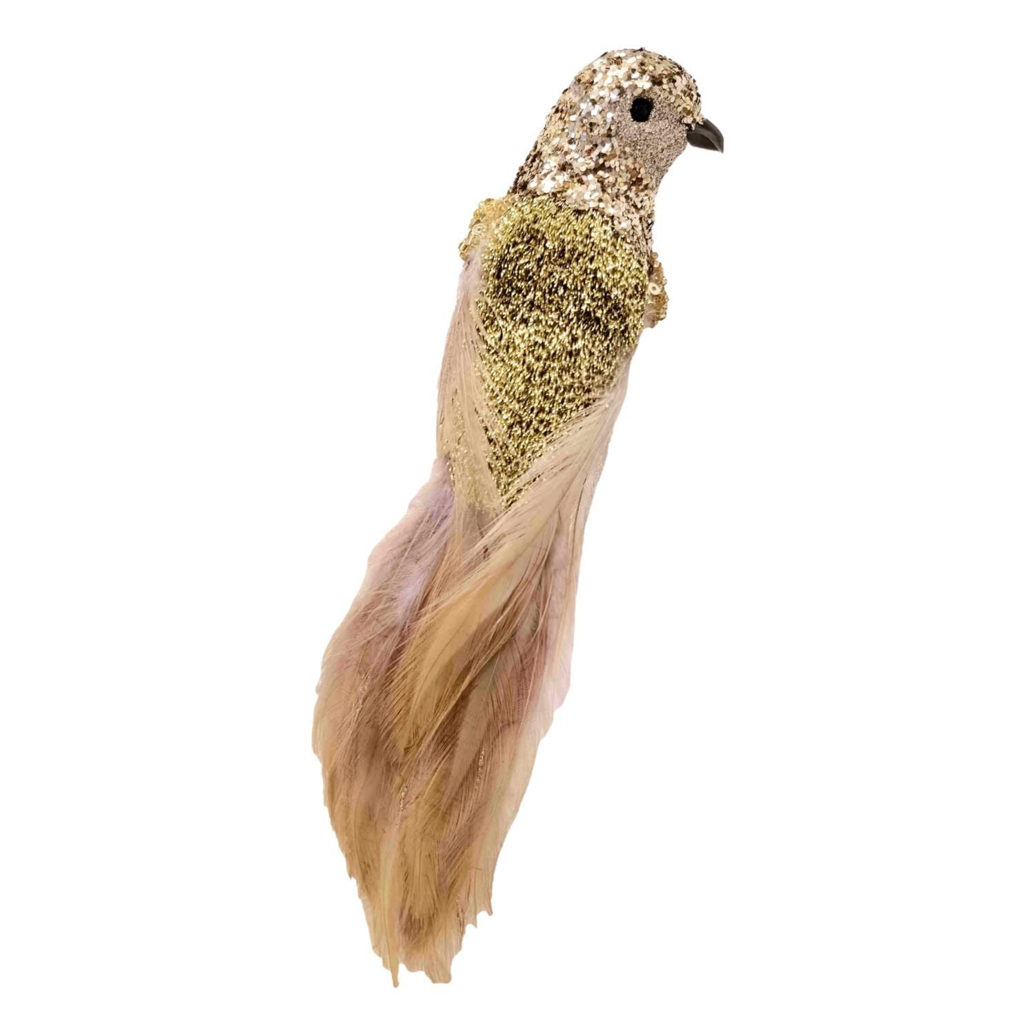 This elegant champagne-colored metallic bird decoration features a glittering body and luxurious feather tail. Measuring at 26cm in length, it comes with a convenient clip-on attachment for easy placement on Christmas trees, wreaths, or festive displays.