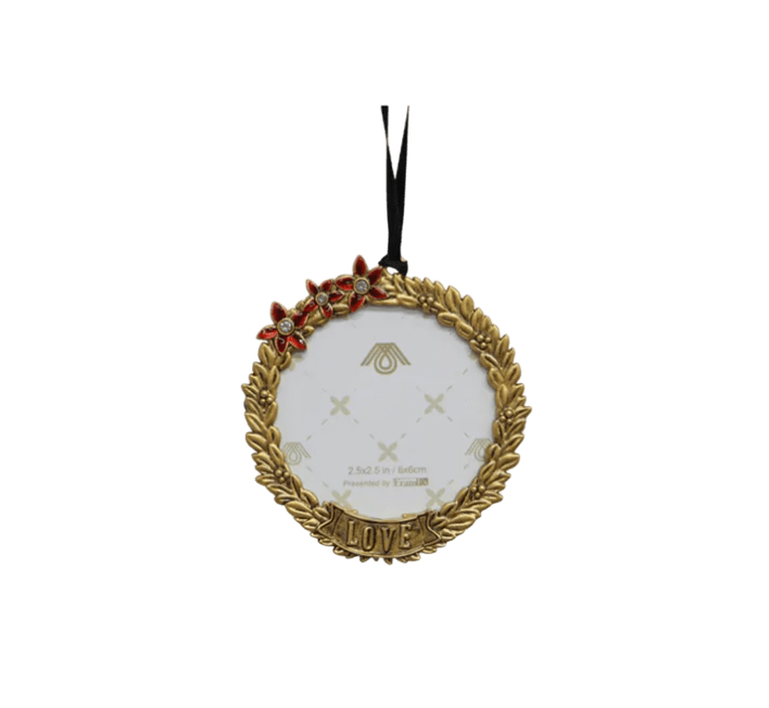 Elegant circular gold frame with "love" delicately stamped in. This 8cm hanging ornament adds a touch of sentiment to your Christmas tree or holiday display. Perfect for showcasing tiny treasures, as a standalone decorative accent or a thoughtful gift for loved ones.