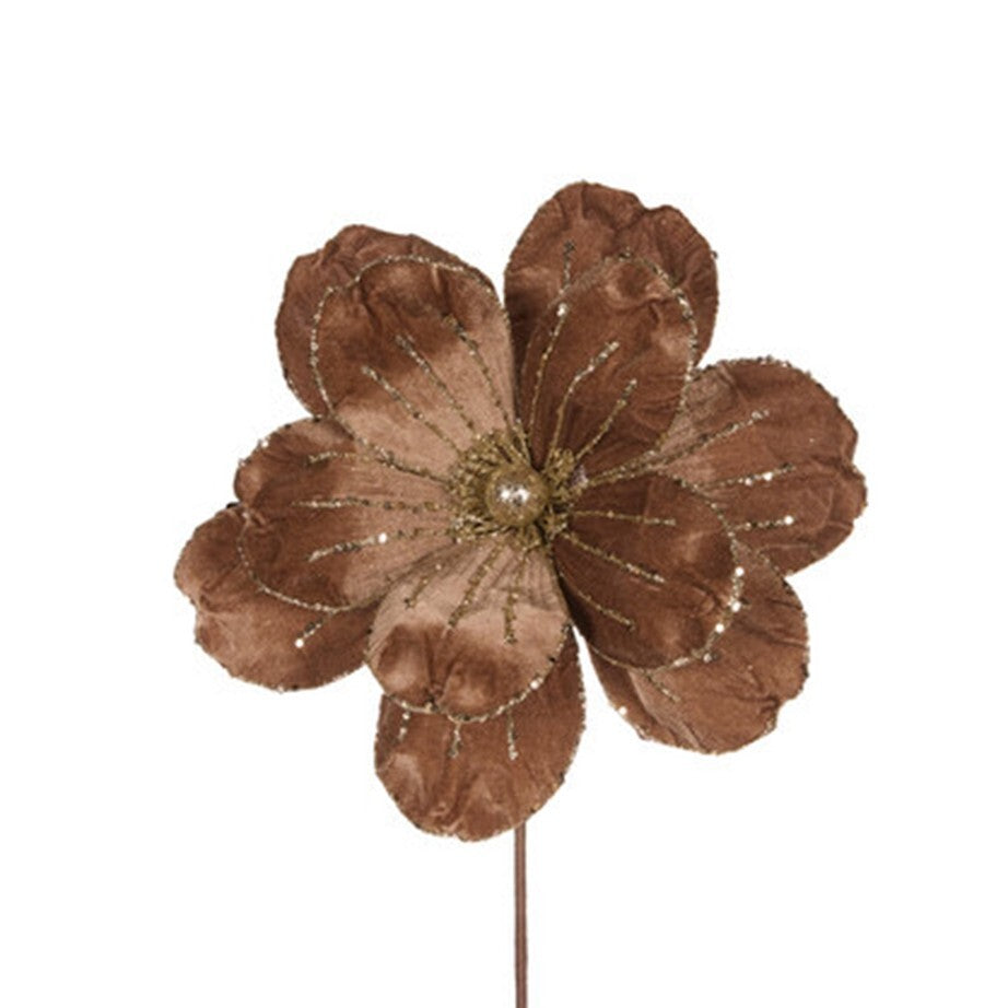 Delicate and sophisticated, this 30cm Magnolia Velour Taupe flower captivates with its soft velour texture and elegant brown hues. Enhanced with subtle gold glitter accents that catch the light beautifully, each bloom features embedded wire that allows for perfect positioning. Create stunning holiday arrangements with this versatile floral accent that brings natural elegance to your Christmas decor.
