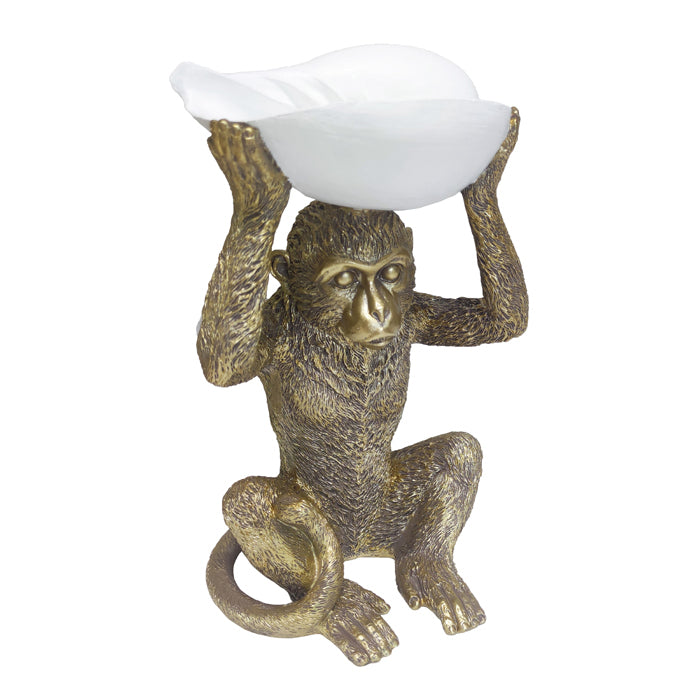 Indulge in luxury with this exquisite Gold Monkey At 29cm tall, this stunning piece features a regal monkey adorned in shimmering gold, delicately grasping a pristine white shell. Add a touch of sophistication and elegance to your decor with this exclusive treasure.