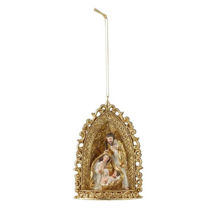 Capture the essence of the holiday season with our Nativity Scene Gold Hanging ornament. Crafted with intricate details and a luxurious gold finish, it exudes elegance and exclusivity. Hang it on the tree or display it on a mantle, this ornament will add a touch of sophistication to any space.