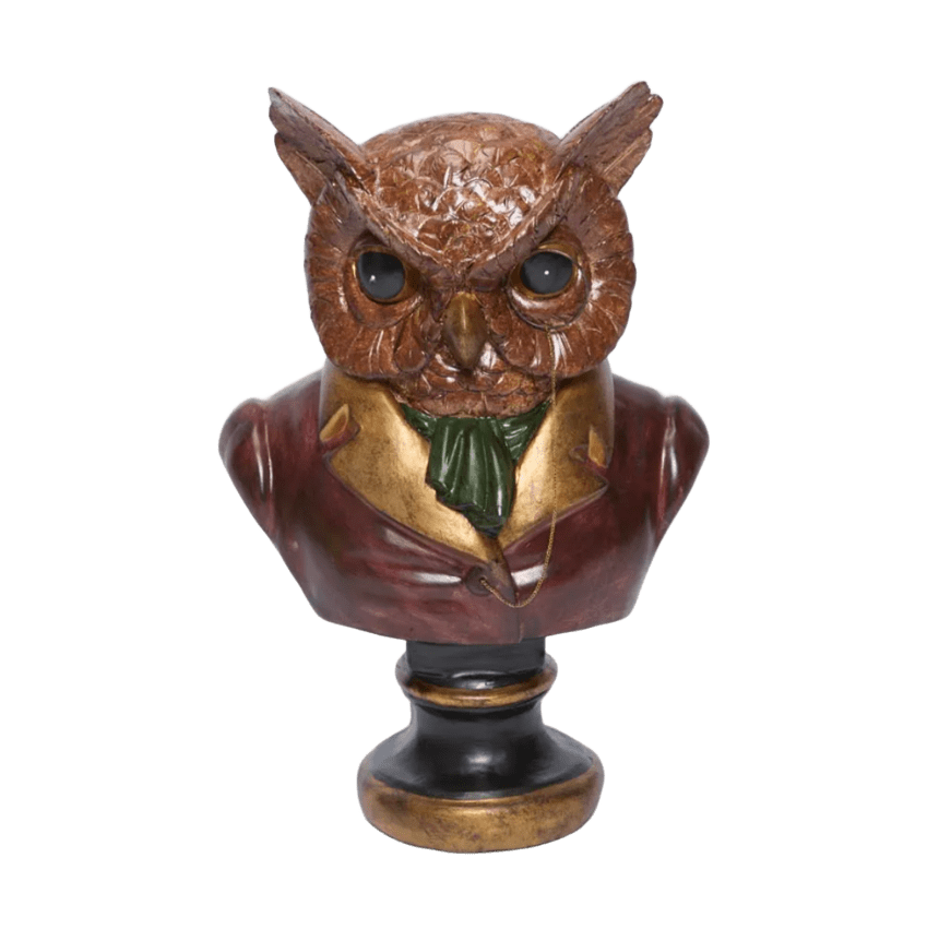 Elevate your home or office decor with this distinguished 52cm owl bust, featuring a refined monocle and elegant green cravat. This sophisticated statement piece brings a touch of whimsical aristocracy to your collection, perfect for creating conversation-worthy displays in entryways or mantels.