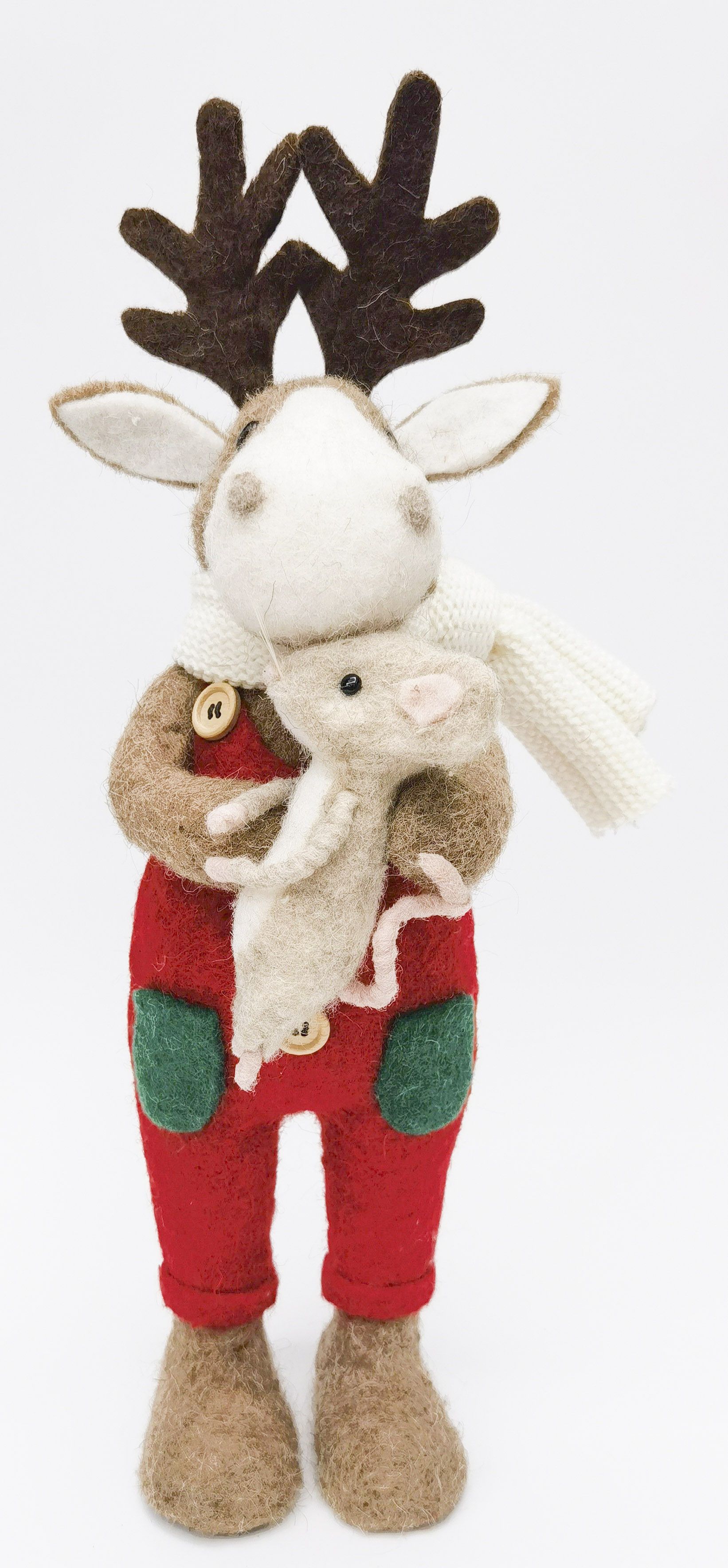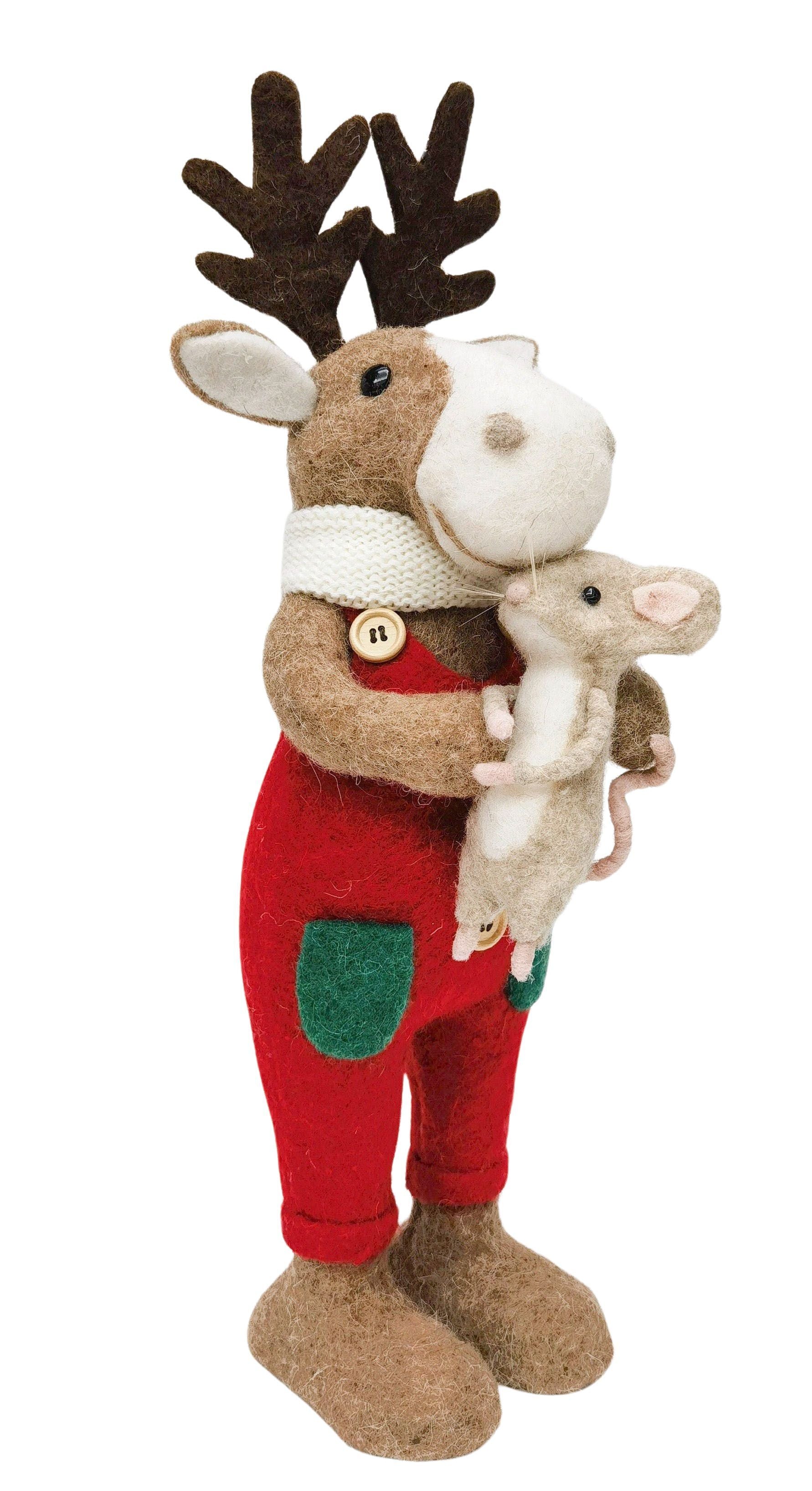 This charming 41cm standing reindeer ornament wears festive red overalls with green pockets and a cosy white scarf. Holding a tiny mouse, it adds a delightful touch of Christmas whimsy to your holiday decor. Perfect for bringing a cute and cheerful spirit to any room.
