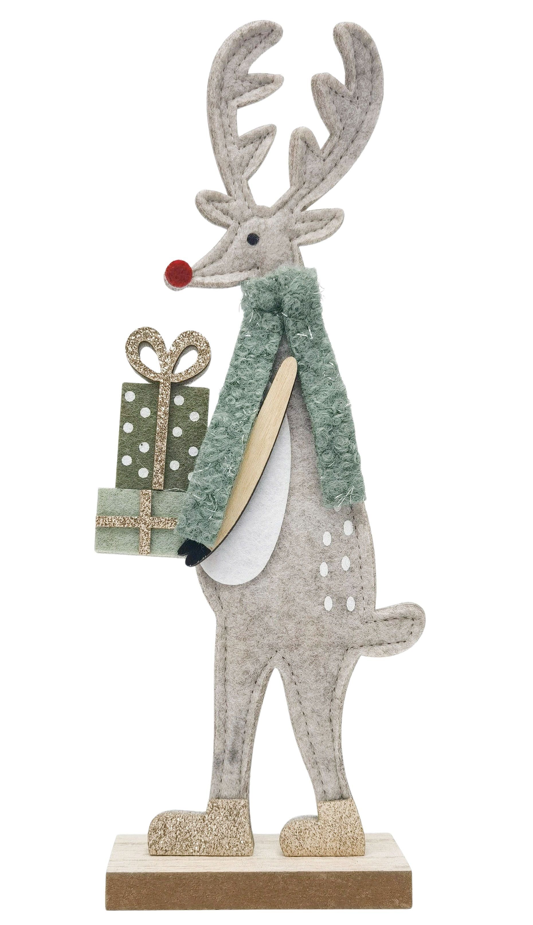 This charming 31cm wooden reindeer ornament features delicate felt detailing and wears a cosy green scarf. Holding soft green presents, it adds a comforting, festive touch to your holiday decor.ย