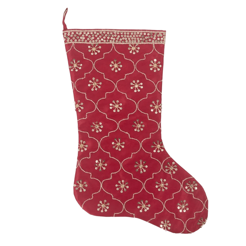 Elevate your holiday decor with this luxurious 45cm red silk Christmas stocking. Featuring intricate mosaic patterns enhanced with elegant gold embroidery and sparkling sequins, this stocking combines traditional festive charm with sophisticated artistry.