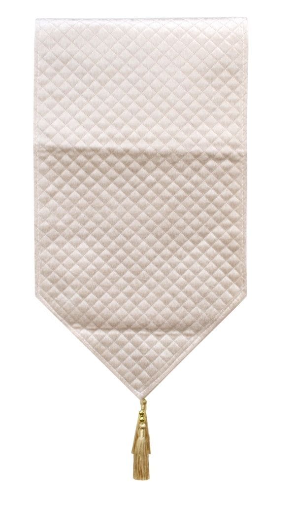 Enhance your dining experience with this elegant 180cm cream table runner featuring a subtle quilted pattern. Its soft, neutral tone complements any decor, while the gold tassels at each end add a refined touch. Perfect for creating a warm and inviting atmosphere at your table.