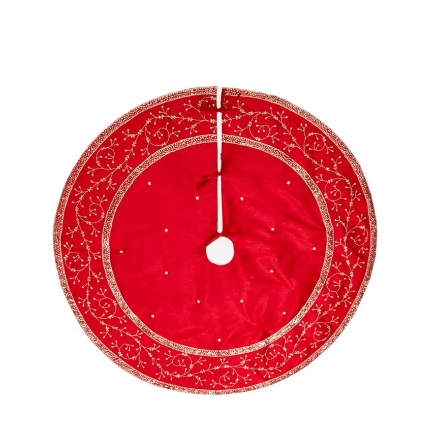 This luxurious 120cm red silk tree skirt elegantly conceals unsightly cords and tree bases while adding festive sophistication to your Christmas display. Beautifully crafted with gold sequins and detailed embroidery, the vibrant red fabric creates a perfect foundation for your tree.